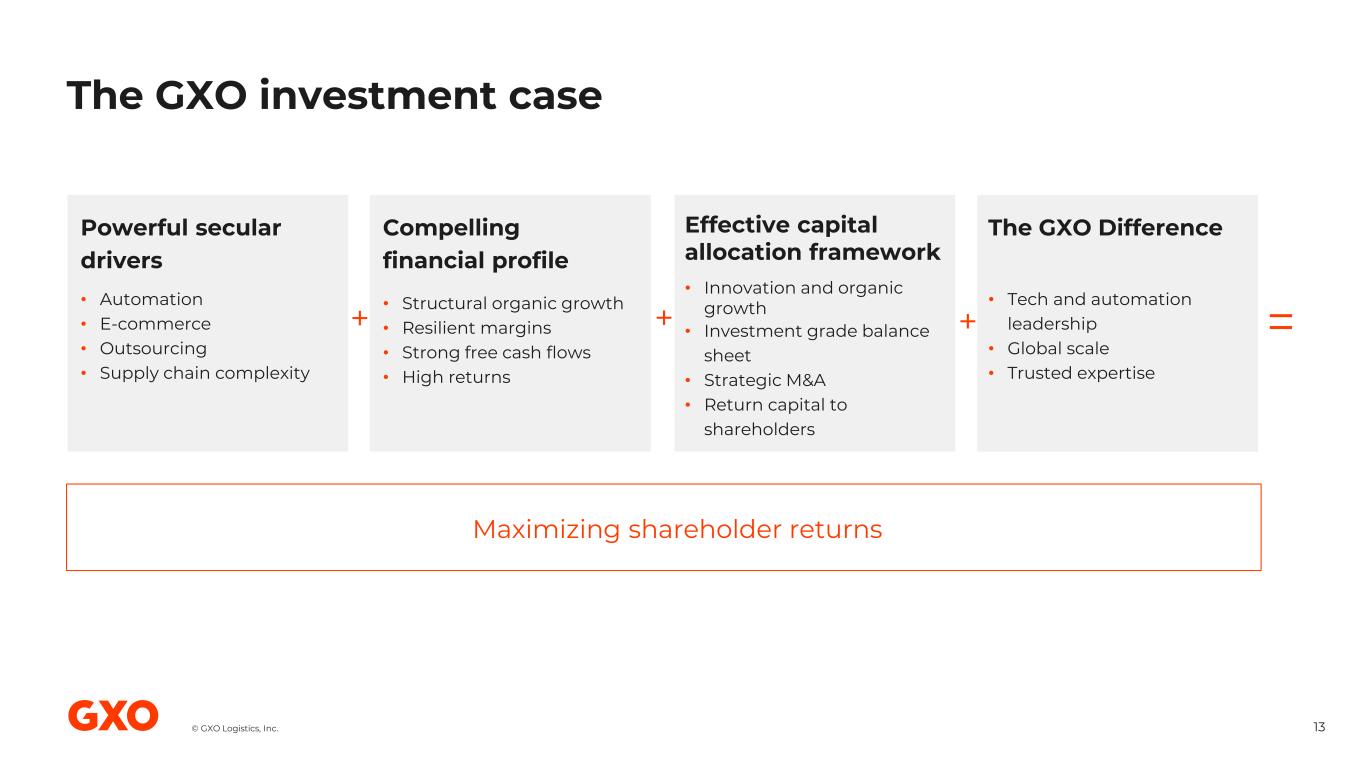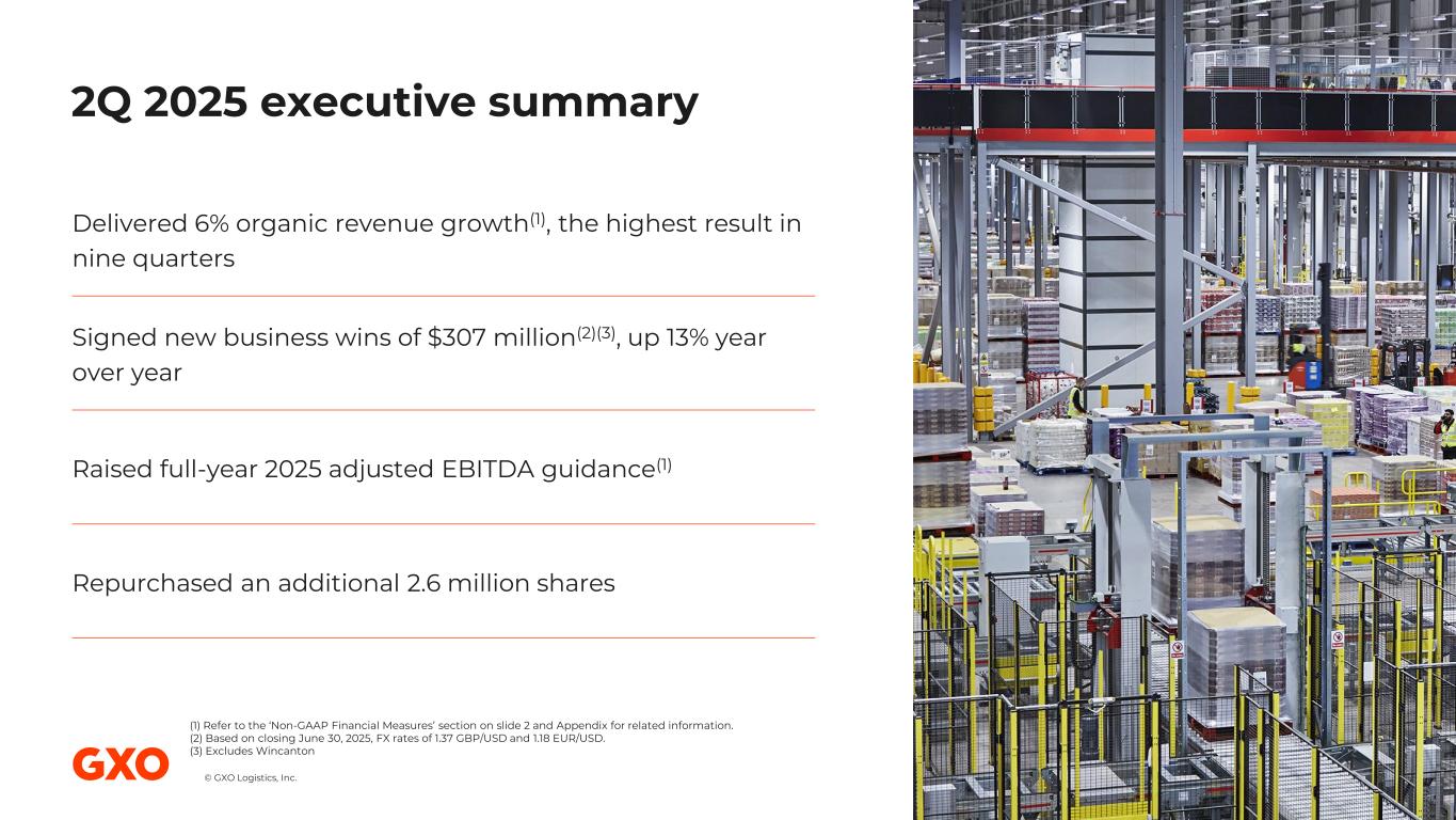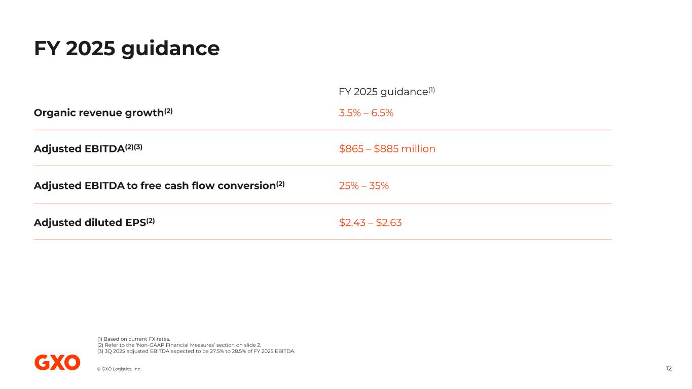© GXO Logistics, Inc. Disclaimer 2 Non-GAAP Financial Measures: As required by the rules of the Securities and Exchange Commission (“SEC”), we provide reconciliations of the non-GAAP financial measures contained in this presentation to the most directly comparable measure under GAAP, which are set forth in the financial tables included in the attached appendix. GXO’s non-GAAP financial measures in this presentation include: adjusted earnings before interest, taxes, depreciation and amortization (“adjusted EBITDA”), adjusted EBITDA margin, adjusted earnings before interest, taxes and amortization (“adjusted EBITA”), adjusted EBITA margin, adjusted EBITA, net of income taxes paid, adjusted net income attributable to GXO, adjusted earnings per share (basic and diluted) (“adjusted EPS”), free cash flow, free cash flow conversion, organic revenue, organic revenue growth, net leverage ratio, net debt, operating return on invested capital (“ROIC”) and net capital expenditures (“net capex”). We believe that the above adjusted financial measures facilitate analysis of our ongoing business operations because they exclude items that may not be reflective of, or are unrelated to, GXO’s core operating performance, and may assist investors with comparisons to prior periods and assessing trends in our underlying businesses. Other companies may calculate these non-GAAP financial measures differently, and therefore our measures may not be comparable to similarly titled measures used by other companies. GXO’s non-GAAP financial measures should only be used as supplemental measures of our operating performance. Adjusted EBITDA, adjusted EBITA, adjusted net income attributable to GXO and adjusted EPS include adjustments for transaction and integration costs, regulatory matters and litigation expenses as well as restructuring costs and other adjustments as set forth in the financial tables included in the attached appendix. Transaction and integration adjustments are generally incremental costs that result from an actual or planned acquisition, divestiture or spin-off and may include transaction costs, consulting fees, retention awards, internal salaries and wages (to the extent the individuals are assigned full-time to integration and transformation activities), and certain costs related to integrating and separating IT systems. Regulatory matters and litigation expenses relate to the settlement of regulatory and legal matters. Restructuring costs primarily relate to severance costs associated with business optimization initiatives. We believe that free cash flow and free cash flow conversion are important measures of our ability to repay maturing debt or fund other uses of capital that we believe will enhance stockholder value. We calculate free cash flow as cash flows from operations less net capex; we calculate net capex as capital expenditures plus proceeds from sale of property and equipment. We calculate free cash flow conversion as free cash flow divided by adjusted EBITDA, expressed as a percentage. We believe that adjusted EBITDA, adjusted EBITDA margin, adjusted EBITA, adjusted EBITA margin, and adjusted EBITA, net of income taxes paid improve comparability from period to period by removing the impact of our capital structure (interest expense), asset base (depreciation and amortization), tax impacts and other adjustments as set forth in the financial tables included in the attached appendix, which management has determined are not reflective of core operating activities and thereby assist investors with assessing trends in our underlying businesses. We believe that adjusted net income attributable to GXO and adjusted EPS improve the comparability of our operating results from period to period by removing the impact of certain costs and gains as set forth in the financial tables included in the attached appendix, which management has determined are not reflective of our core operating activities, including amortization of intangible assets acquired. We believe that organic revenue and organic revenue growth are important measures because they exclude the impact of foreign currency exchange rate fluctuations and revenue from acquired businesses. We believe that net leverage ratio and net debt are important measures of our overall liquidity position and are calculated by adding bank overdrafts and removing cash and cash equivalents (excluding restricted cash) from our total debt and net debt as a ratio of our trailing twelve months adjusted EBITDA. We calculate ROIC as our trailing twelve months adjusted EBITA, net of income taxes paid, divided by the average invested capital. We believe ROIC provides investors with an important perspective on how effectively GXO deploys capital and use this metric internally as a high-level target to assess overall performance throughout the business cycle. Management uses these non-GAAP financial measures in making financial, operating and planning decisions and evaluating GXO’s ongoing performance. With respect to our financial targets for full-year 2025 organic revenue growth, adjusted EBITDA, adjusted diluted EPS, and free cash flow conversion and third quarter 2025 adjusted EBITDA, a reconciliation of these non-GAAP measures to the corresponding GAAP measures is not available without unreasonable effort due to the variability and complexity of the reconciling items described above that we exclude from these non-GAAP target measures. The variability of these items may have a significant impact on our future GAAP financial results and, as a result, we are unable to prepare the forward-looking statements of income and cash flows prepared in accordance with GAAP, that would be required to produce such a reconciliation. Forward-Looking Statements: This presentation includes forward-looking statements within the meaning of Section 27A of the Securities Act of 1933, as amended, and Section 21E of the Securities Exchange Act of 1934, a
