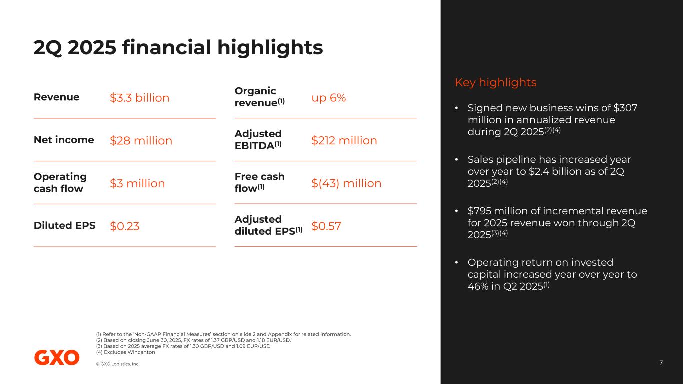 © GXO Logistics, Inc. 2Q 2025 executive summary Delivered 6% organic revenue growth(1), the highest result in nine quarters Signed new business wins of $307 million(2)(3), up 13% year over year Raised full-year 2025 adjusted EBITDA guidance(1) Repurchased an additional 2.6 million shares 6 (1) Refer to the ‘Non-GAAP Financial Measures’ section on slide 2 and Appendix for related information. (2) Based on closing June 30, 2025, FX rates of 1.37 GBP/USD and 1.18 EUR/USD. (3) Excludes Wincanton