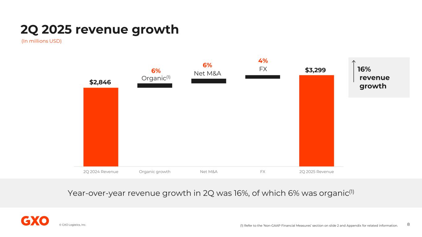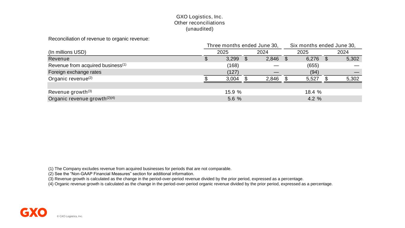 © GXO Logistics, Inc. GXO Logistics, Inc. Other reconciliations (unaudited) Reconciliation of revenue to organic revenue: Three months ended June 30, Six months ended June 30, (In millions USD) 2025 2024 2025 2024 Revenue $ 3,299 $ 2,846 $ 6,276 $ 5,302 Revenue from acquired business(1) (168) — (655) — Foreign exchange rates (127) — (94) — Organic revenue(2) $ 3,004 $ 2,846 $ 5,527 $ 5,302 Revenue growth(3) 15.9 % 18.4 % Organic revenue growth(2)(4) 5.6 % 4.2 % (1) The Company excludes revenue from acquired businesses for periods that are not comparable. (2) See the “Non-GAAP Financial Measures” section for additional information. (3) Revenue growth is calculated as the change in the period-over-period revenue divided by the prior period, expressed as a percentage. (4) Organic revenue growth is calculated as the change in the period-over-period organic revenue divided by the prior period, expressed as a percentage.
