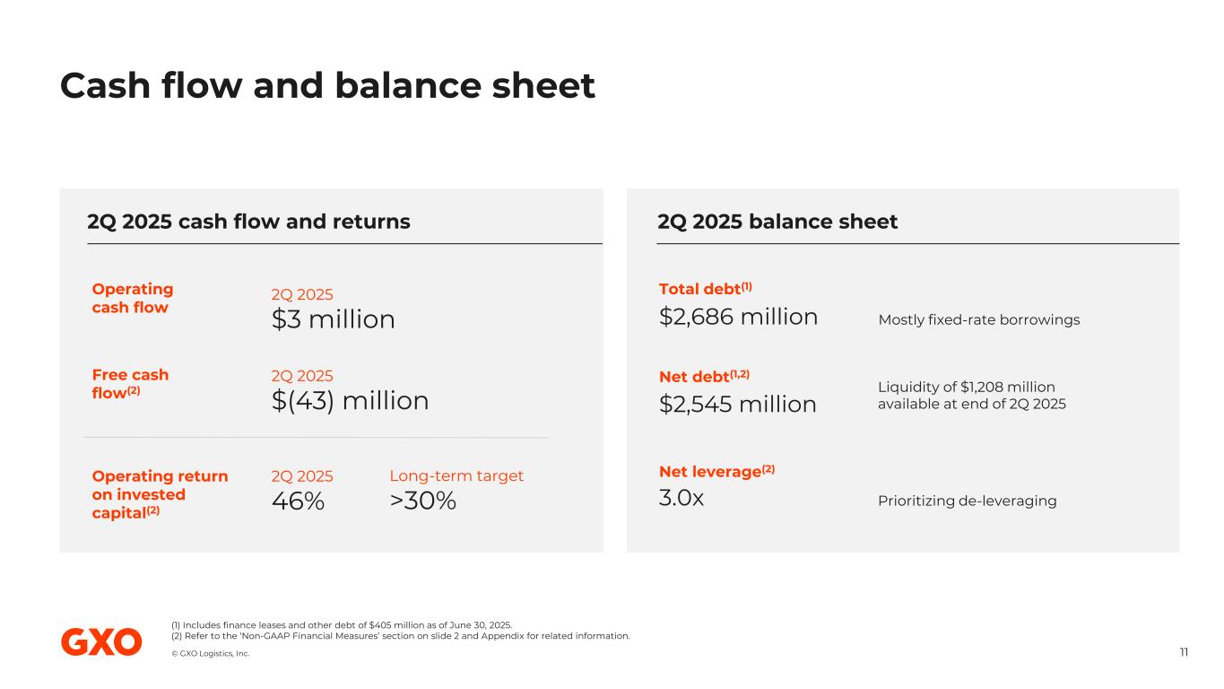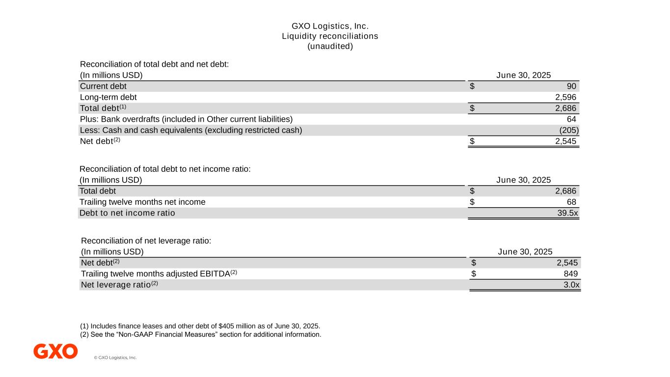 © GXO Logistics, Inc. GXO Logistics, Inc. Liquidity reconciliations (unaudited) Reconciliation of total debt and net debt: (In millions USD) June 30, 2025 Current debt $ 90 Long-term debt 2,596 Total debt(1) $ 2,686 Plus: Bank overdrafts (included in Other current liabilities) 64 Less: Cash and cash equivalents (excluding restricted cash) (205) Net debt(2) $ 2,545 Reconciliation of total debt to net income ratio: (In millions USD) June 30, 2025 Total debt $ 2,686 Trailing twelve months net income $ 68 Debt to net income ratio 39.5x Reconciliation of net leverage ratio: (In millions USD) June 30, 2025 Net debt(2) $ 2,545 Trailing twelve months adjusted EBITDA(2) $ 849 Net leverage ratio(2) 3.0x (1) Includes finance leases and other debt of $405 million as of June 30, 2025. (2) See the “Non-GAAP Financial Measures” section for additional information.