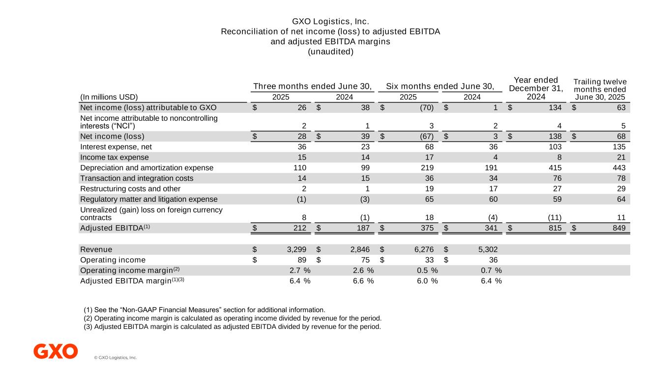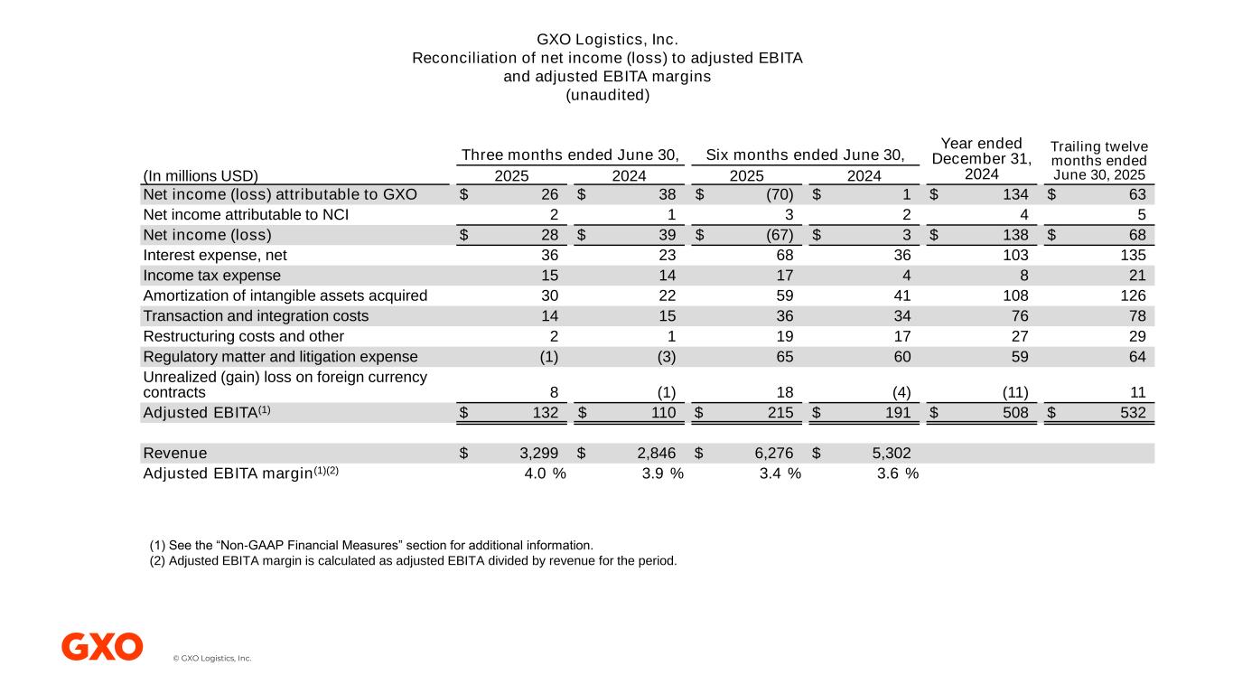 © GXO Logistics, Inc. GXO Logistics, Inc. Reconciliation of net income (loss) to adjusted EBITDA and adjusted EBITDA margins (unaudited) Three months ended June 30, Six months ended June 30, Year ended December 31, 2024 Trailing twelve months ended June 30, 2025(In millions USD) 2025 2024 2025 2024 Net income (loss) attributable to GXO $ 26 $ 38 $ (70) $ 1 $ 134 $ 63 Net income attributable to noncontrolling interests (“NCI”) 2 1 3 2 4 5 Net income (loss) $ 28 $ 39 $ (67) $ 3 $ 138 $ 68 Interest expense, net 36 23 68 36 103 135 Income tax expense 15 14 17 4 8 21 Depreciation and amortization expense 110 99 219 191 415 443 Transaction and integration costs 14 15 36 34 76 78 Restructuring costs and other 2 1 19 17 27 29 Regulatory matter and litigation expense (1) (3) 65 60 59 64 Unrealized (gain) loss on foreign currency contracts 8 (1) 18 (4) (11) 11 Adjusted EBITDA(1) $ 212 $ 187 $ 375 $ 341 $ 815 $ 849 Revenue $ 3,299 $ 2,846 $ 6,276 $ 5,302 Operating income $ 89 $ 75 $ 33 $ 36 Operating income margin(2) 2.7 % 2.6 % 0.5 % 0.7 % Adjusted EBITDA margin(1)(3) 6.4 % 6.6 % 6.0 % 6.4 % (1) See the “Non-GAAP Financial Measures” section for additional information. (2) Operating income margin is calculated as operating income divided by revenue for the period. (3) Adjusted EBITDA margin is calculated as adjusted EBITDA divided by revenue for the period.