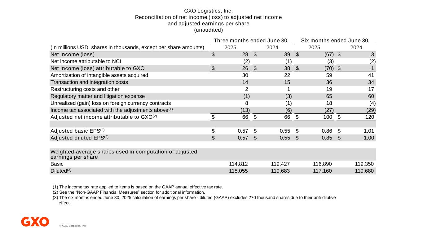 © GXO Logistics, Inc. GXO Logistics, Inc. Reconciliation of net income (loss) to adjusted net income and adjusted earnings per share (unaudited) Three months ended June 30, Six months ended June 30, (In millions USD, shares in thousands, except per share amounts) 2025 2024 2025 2024 Net income (loss) $ 28 $ 39 $ (67) $ 3 Net income attributable to NCI (2) (1) (3) (2) Net income (loss) attributable to GXO $ 26 $ 38 $ (70) $ 1 Amortization of intangible assets acquired 30 22 59 41 Transaction and integration costs 14 15 36 34 Restructuring costs and other 2 1 19 17 Regulatory matter and litigation expense (1) (3) 65 60 Unrealized (gain) loss on foreign currency contracts 8 (1) 18 (4) Income tax associated with the adjustments above(1) (13) (6) (27) (29) Adjusted net income attributable to GXO(2) $ 66 $ 66 $ 100 $ 120 Adjusted basic EPS(2) $ 0.57 $ 0.55 $ 0.86 $ 1.01 Adjusted diluted EPS(2) $ 0.57 $ 0.55 $ 0.85 $ 1.00 Weighted-average shares used in computation of adjusted earnings per share Basic 114,812 119,427 116,890 119,350 Diluted(3) 115,055 119,683 117,160 119,680 (1) The income tax rate applied to items is based on the GAAP annual effective tax rate. (2) See the “Non-GAAP Financial Measures” section for additional information. (3) The six months ended June 30, 2025 calculation of earnings per share - diluted (GAAP) excludes 270 thousand shares due to their anti-dilutive effect.
