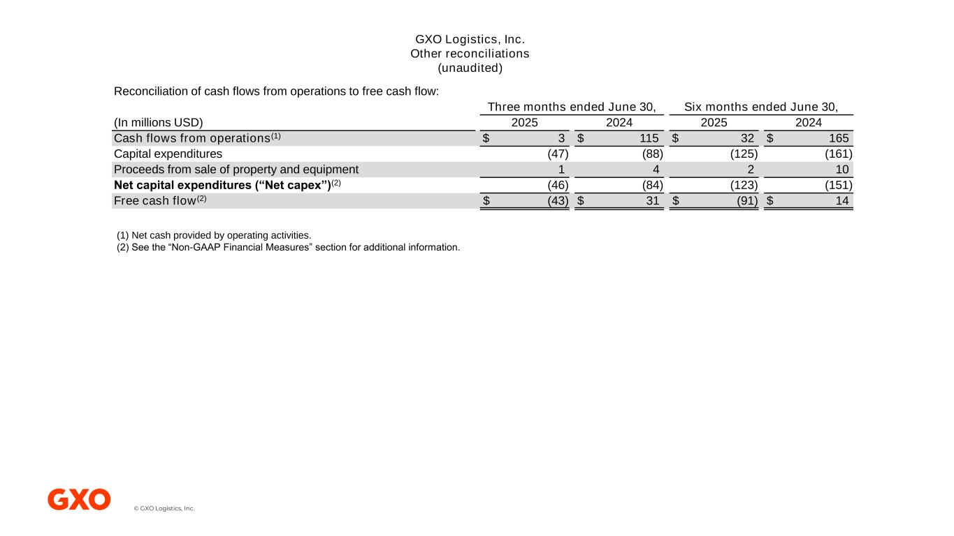 © GXO Logistics, Inc. GXO Logistics, Inc. Other reconciliations (unaudited) Reconciliation of cash flows from operations to free cash flow: Three months ended June 30, Six months ended June 30, (In millions USD) 2025 2024 2025 2024 Cash flows from operations(1) $ 3 $ 115 $ 32 $ 165 Capital expenditures (47) (88) (125) (161) Proceeds from sale of property and equipment 1 4 2 10 Net capital expenditures (“Net capex”)(2) (46) (84) (123) (151) Free cash flow(2) $ (43) $ 31 $ (91) $ 14 (1) Net cash provided by operating activities. (2) See the “Non-GAAP Financial Measures” section for additional information.