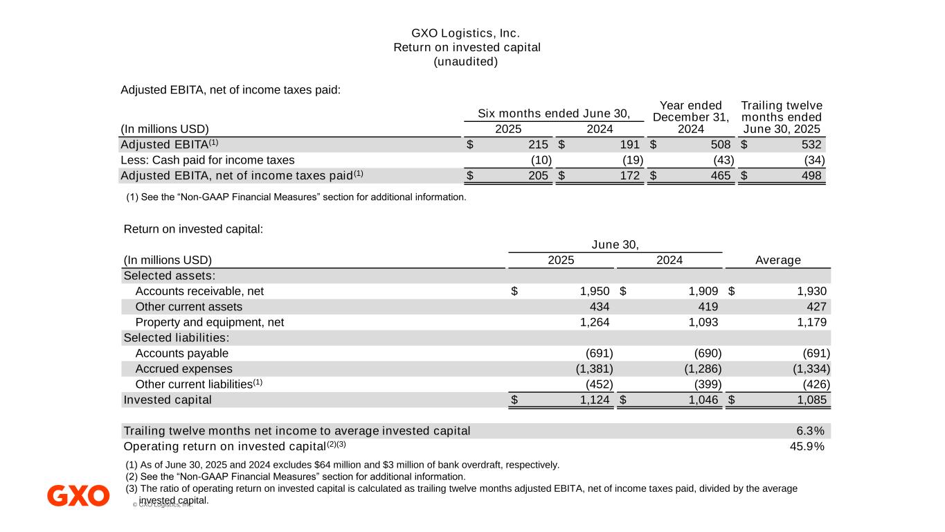 © GXO Logistics, Inc. Adjusted EBITA, net of income taxes paid: Six months ended June 30, Year ended December 31, 2024 Trailing twelve months ended June 30, 2025(In millions USD) 2025 2024 Adjusted EBITA(1) $ 215 $ 191 $ 508 $ 532 Less: Cash paid for income taxes (10) (19) (43) (34) Adjusted EBITA, net of income taxes paid(1) $ 205 $ 172 $ 465 $ 498 Return on invested capital: June 30, (In millions USD) 2025 2024 Average Selected assets: Accounts receivable, net $ 1,950 $ 1,909 $ 1,930 Other current assets 434 419 427 Property and equipment, net 1,264 1,093 1,179 Selected liabilities: Accounts payable (691) (690) (691) Accrued expenses (1,381) (1,286) (1,334) Other current liabilities(1) (452) (399) (426) Invested capital $ 1,124 $ 1,046 $ 1,085 Trailing twelve months net income to average invested capital 6.3 % Operating return on invested capital(2)(3) 45.9 % GXO Logistics, Inc. Return on invested capital (unaudited) (1) As of June 30, 2025 and 2024 excludes $64 million and $3 million of bank overdraft, respectively. (2) See the “Non-GAAP Financial Measures” section for additional information. (3) The ratio of operating return on invested capital is calculated as trailing twelve months adjusted EBITA, net of income taxes paid, divided by the average invested capital. (1) See the “Non-GAAP Financial Measures” section for additional information.