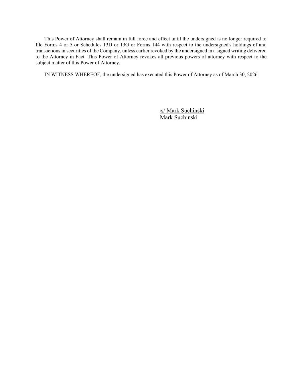 This Power of Attorney shall remain in full force and effect until the undersigned is no longer required to file Forms 4 or 5 or Schedules 13D or 13G or Forms 144 with respect to the undersigned's holdings of and transactions in securities of the Company, unless earlier revoked by the undersigned in a signed writing delivered to the Attorney-in-Fact. This Power of Attorney revokes all previous powers of attorney with respect to the subject matter of this Power of Attorney. IN WITNESS WHEREOF, the undersigned has executed this Power of Attorney as of March 30, 2026. /s/ Mark Suchinski Mark Suchinski